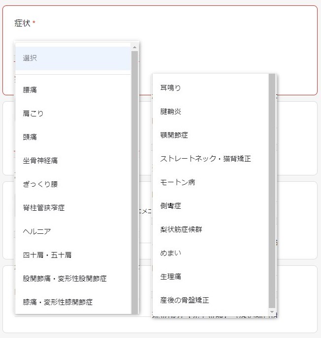 ドロップダウンリストよりお客様の症状を「選択入力」してください。