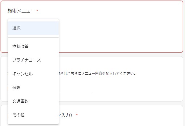 ドロップダウンリストより施術メニューを「選択入力」してください。
