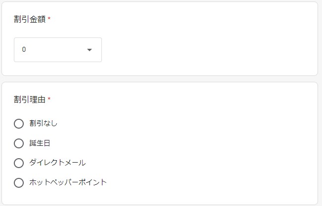 割引金額を「選択入力」、割引理由を「選択入力」してください。