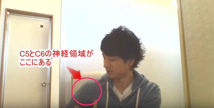神経ラインを見ていただくと、どこで神経の領域あるかといいますと、C5とC6の間の神経の領域がここになります。