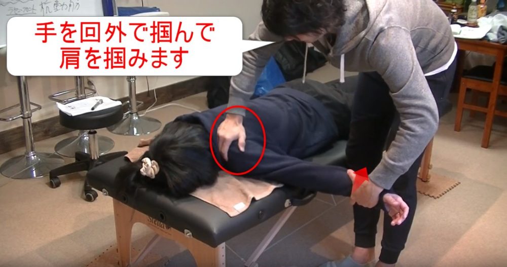 手を回外で掴んで肩を掴む